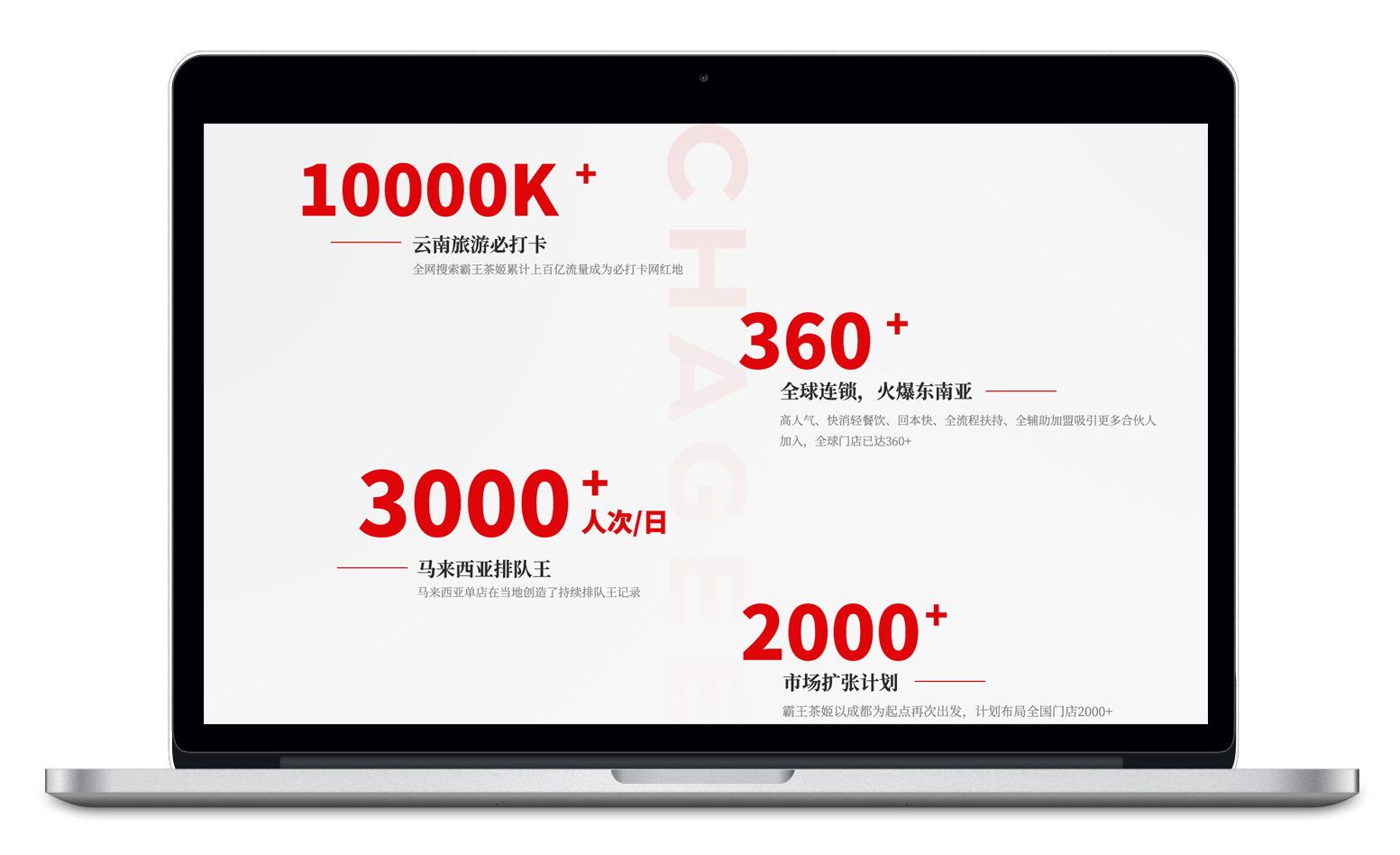 人們對于數(shù)字的敏感度遠高于其他文字和圖片,根據(jù)霸王別姬品牌的發(fā)展歷程,在這一塊的處理方式上,我們整理了品牌的一些關鍵數(shù)據(jù),采用階梯式的左右布局輔以簡要文字說明,這些都是霸王茶姬品牌發(fā)展至今成果沉淀。
